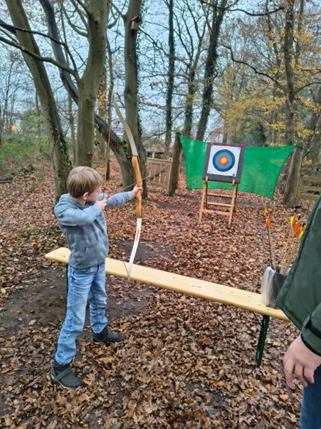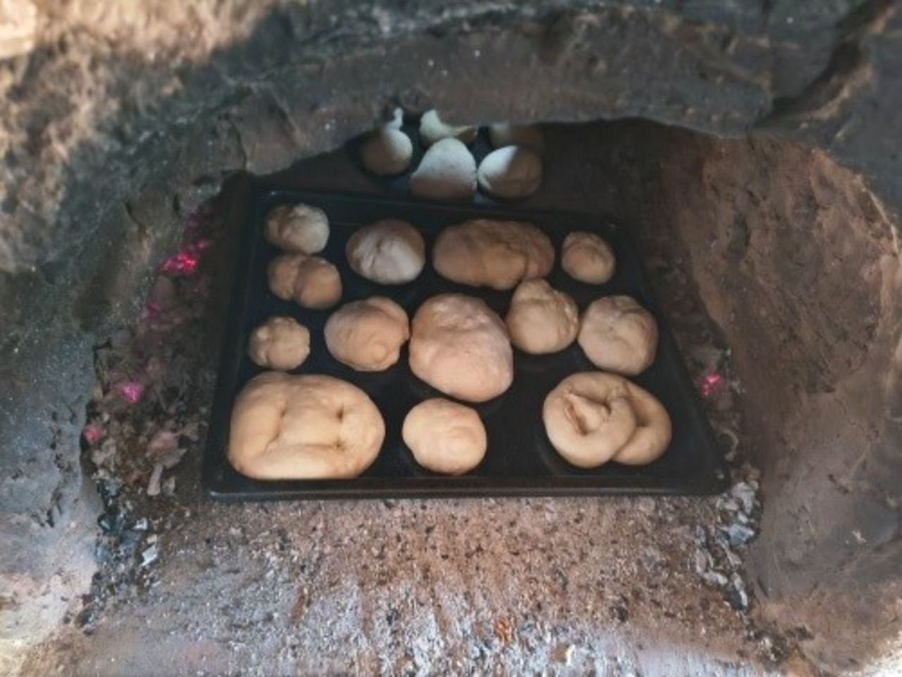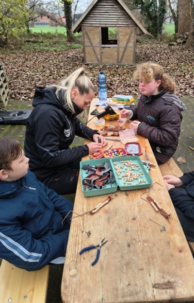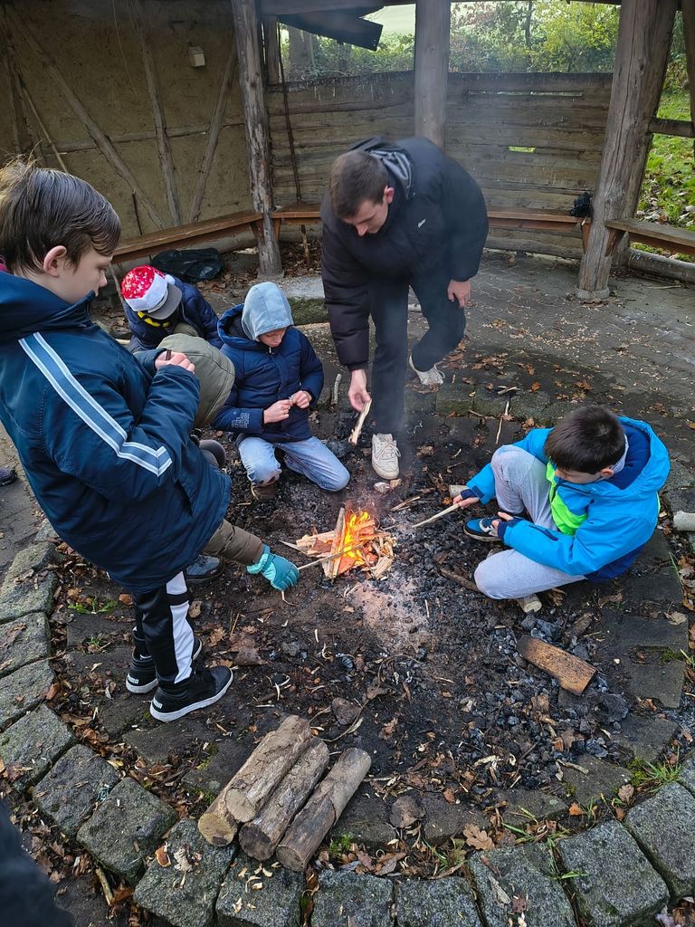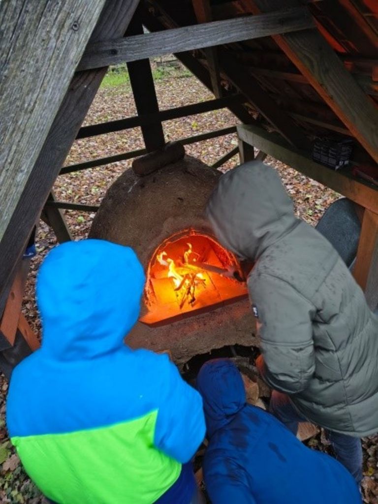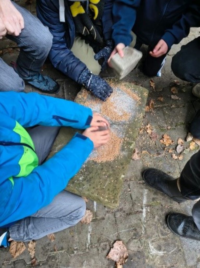 Herr Engels, Herr Lühn und Frau Reinink boten im Rahmen ihres Studiums an der Saxion ein erlebnispädagogisches Projekt an. An beiden Tagen konnten die Schüler*innen den Ofen anfeuern und darin Brot backen. Sie erfuhren, wie anstrengend es ist, Körner zu Mehl zu mahlen, machten selbstständig mit Feuerstein und geeignetem Brennmaterial Feuer, stellten Schmuck her und übten sich im Bogenschießen. Ergänzt wurde das Programm durch Gruppenspiele, die das Gemeinschaftsgefühl der Klasse stärkten.